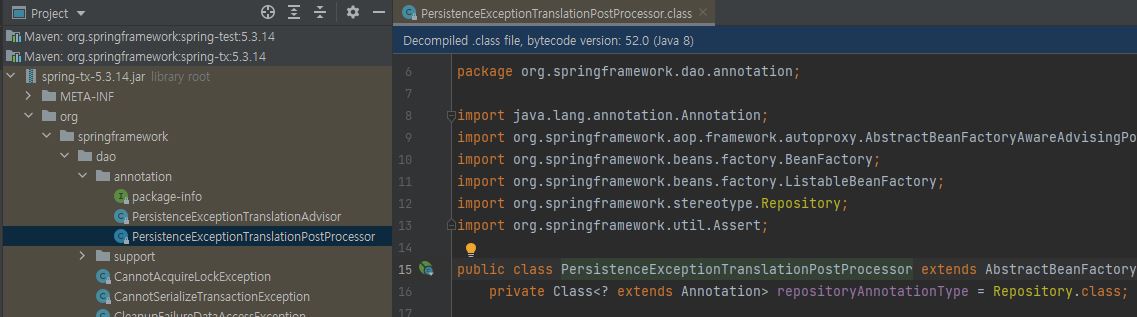 해당 클래스는 spring-tx 모듈에 존재하는 패키지이며 spring-boot-starter-jdbc 의존성에도 포함되어있다. Repository 어노테이션과 spring-tx 모듈이 존재하면 @Repository 어노테이션이 선언된 target class를 Proxy로 래핑하여 Bean으로 생성하기 때문에 위에서 @Repository 어노테이션으로 Bean을 생성하고 테스트했을때 실패가 된 것이다.