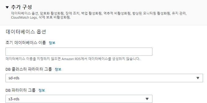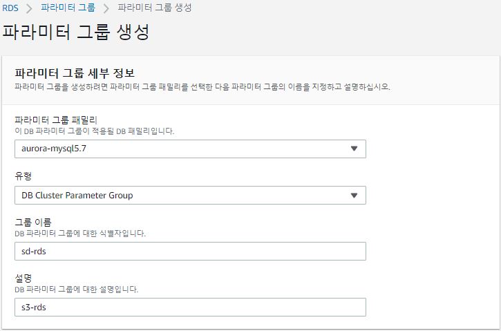 default 파라미터 그룹은 수정이 불가능 하기 때문에 새로운 파라미터 그룹을 생성해준다. 이때 파라미터 그룹을 유형별로 각각 생성해줘야 한다. DB Cluster Parameter Group, DB Parameter Group