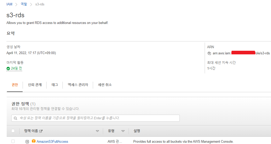 Aurora MySQL에서 S3에 파일을 읽어드리고 쓰기위해 AmazonS3FullAccess 정책을 가진 Role을 생성해준다.