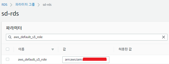 DB Cluster Parameter Group에 들어가서 aws_default_s3_role 이라는 파라미터에 위에서 복사한 ARN 값을 추가해주자.