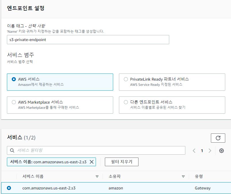 VPC -> 엔드포인트 > 엔드포인트 생성을 클릭하여 RDS와 S3간 내부통신을 하기위해 VPC 엔드포인트를 생성하자.
