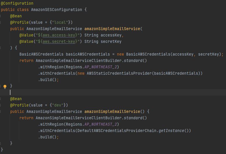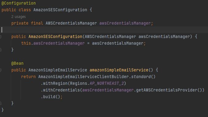 위 코드는 AWS SES를 이용하기 위해 AmazonSimpleEmailService 타입의 Bean을 생성하는 코드입니다.