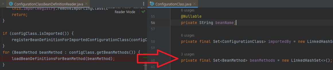 ConfigurationClassBeanDefinitionReader 클래스는 @Configuration이 선언된 클래스를 읽어드린 후 @Bean이 선언된 메서드들을 순회하면서 Spring Bean으로 등록합니다. 그리고 getBeanMethods 메서드는 내부적으로 LinkedHashSet으로 구현돼 있어 순서가 보장됩니다. 아마 여기서 말하는 순서는 선언순서를 얘기하는 것 같습니다.