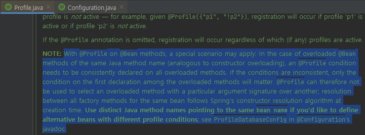 @Configuration의 내용을 살펴보면 @Profile에 관한 두 가지 예제가 나옵니다.