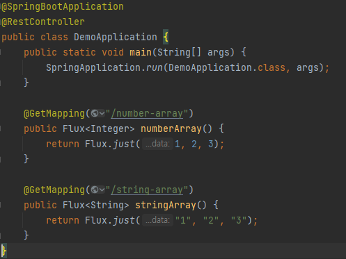 즉, Flux<String>을 JSON Array로 응답하려면 Flux의 collectToList 메서드를 호출하여 Mono<List<String>>로 반환해서 주면 됩니다.