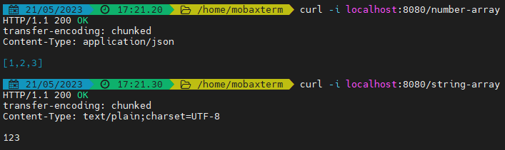 Flux<Integer>를 반환하는 API에 요청을 보내면 Content-Type이 application/json, Body는 JSON Array로 응답합니다.