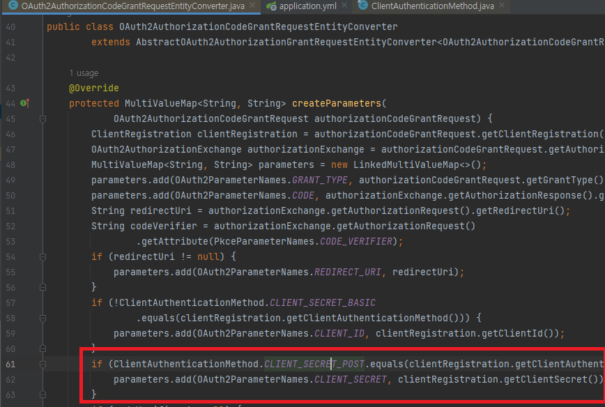 client-authentication-method 프로퍼티에 POST로 정의하면 해당 조건문이 false가 되어 Access Token 발급 API를 호출할 때 client-secret 파라미터가 추가되지 않습니다.