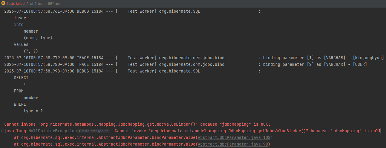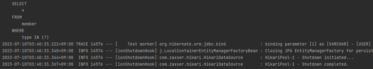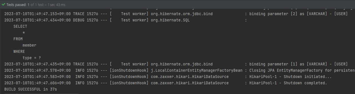 테스트코드는 간단합니다. Member 객체를 생성 후 DB에 저장하고 type으로 다시 조회해 오는 코드입니다.