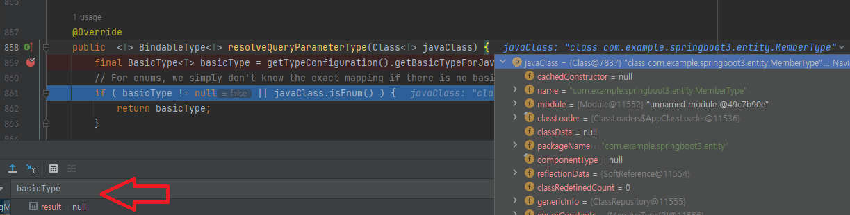 basicType 변수를 확인해 보니 null이 저장되어 있고 isEnum 메서드를 호출하면 true가 반환되어 해당 메서드는 null을 반환하게 됩니다.