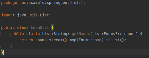 먼저 파라미터로 List<Enum<?>>을 받는 정적 메서드를 생성 후 Stream으로 순회하면서 name을 반환하게끔 합니다.