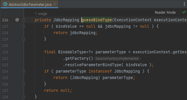 2. SessionFactoryImpl#resolveParamterBindType 메서드에서 전달된 파라미터로 Bind 타입을 조회