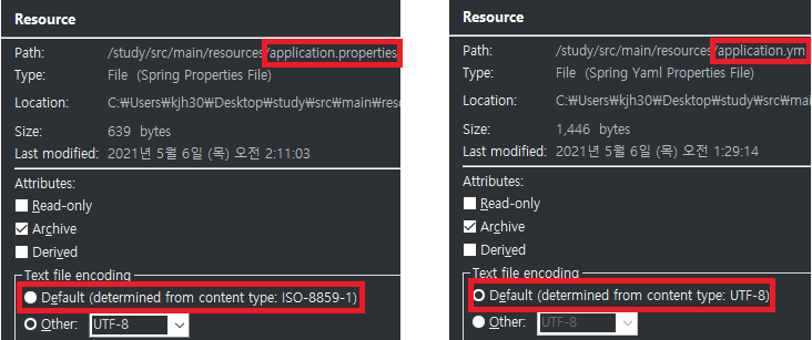 application.properties 파일의 default encoding값은 ISO_8859_1이며, application.yml은 UTF-8이다. UTF-8로 변경해도 런타임시 default encoding으로 동작되는것 같다.